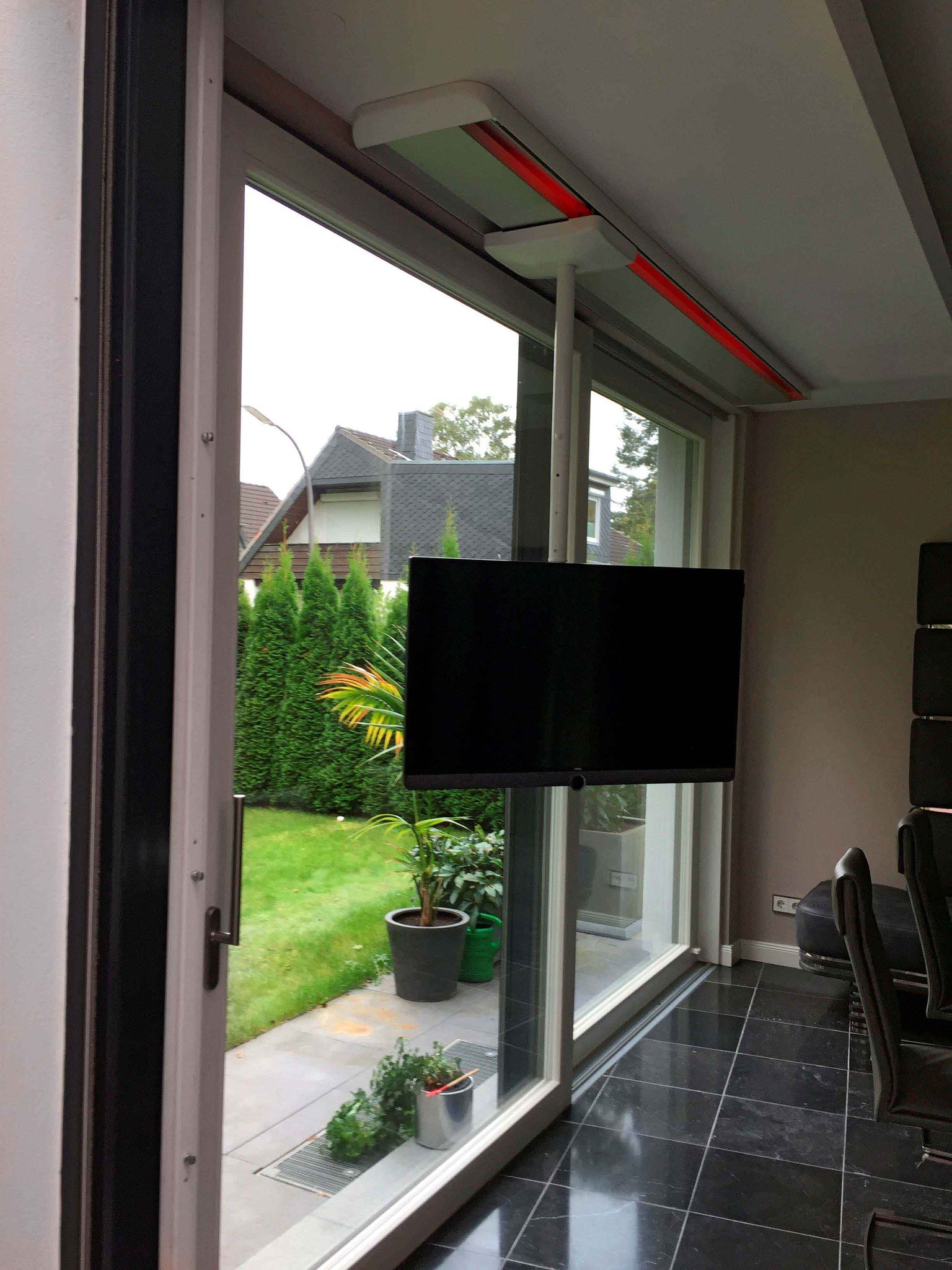 ScreenTrain, de horizontaal handmatig verplaatsbare, 360 graden draai- en kantelbare tv plafondbeugel op railsysteem brengt je tv in één beweging van de eethoek naar het terras naar je bank.