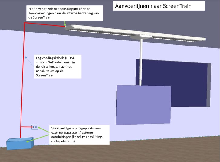 Onderstaand schema toont een voorbeeld van een concept voor het leggen van de inkomende kabels. U hoeft alleen uw kabels tot aan de zijkap van de ScreenTrain te leggen (in-wall of on-wall). Sluit vervolgens de interne kabels van de ScreenTrain aan op je toevoerleidingen aan de ene kant en op je tv aan de andere kant --> klaar